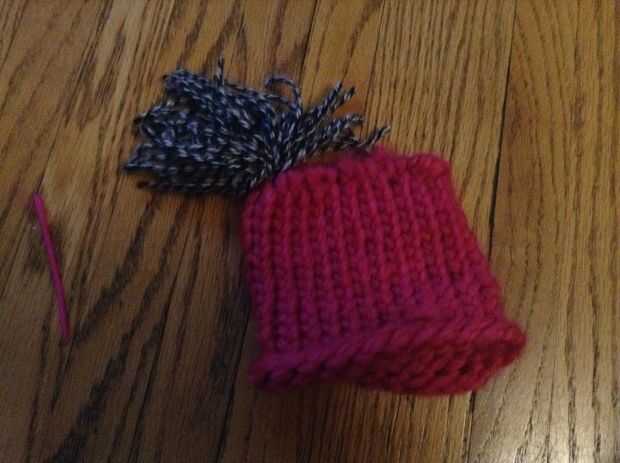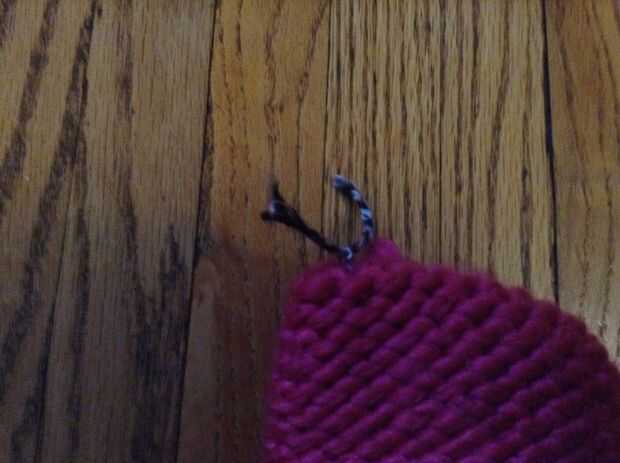 Gire usted sombrero de adentro hacia afuera y tire dos pedazo de hilo a través de y ate tu pompón del interior girar su sombrero de la derecha hacia fuera. Ahora repita los pasos 9-15 una vez más.