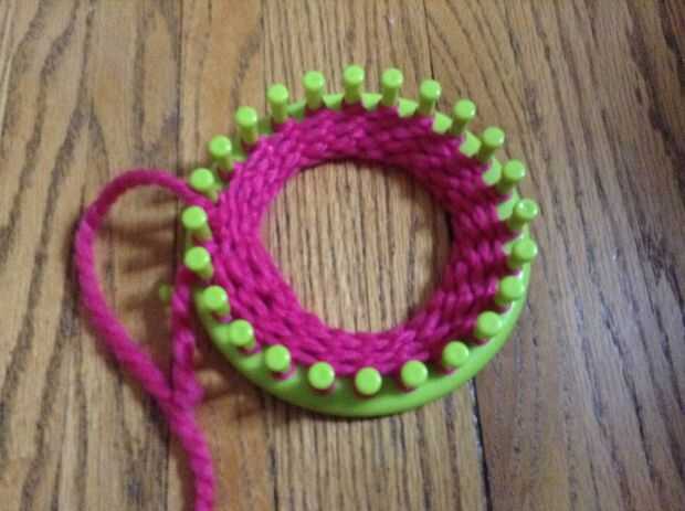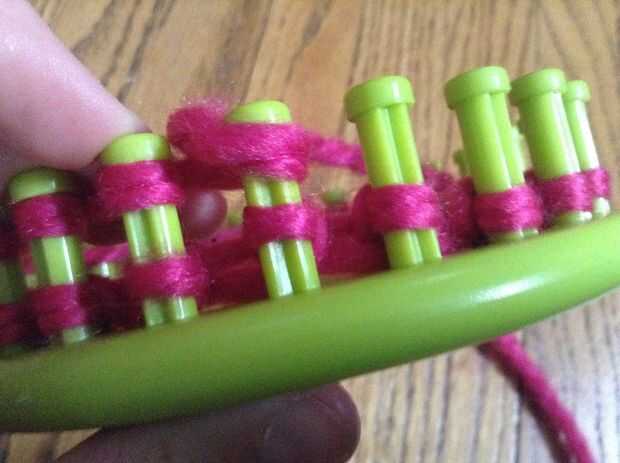 ThiPaso 1: materiales -hilo-telar que hace punto-gancho de tejerPaso 2: Configurar el telar Primero Envuelva el hilo alrededor de la clavija de la parte inferior en telar. Esto ayuda a mantener el hilo en su lugar. A continuación, empezar a envolver