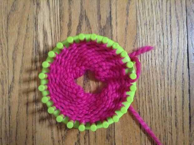 ThiPaso 1: materiales -hilo-telar que hace punto-gancho de tejerPaso 2: Configurar el telar Primero Envuelva el hilo alrededor de la clavija de la parte inferior en telar. Esto ayuda a mantener el hilo en su lugar. A continuación, empezar a envolver
