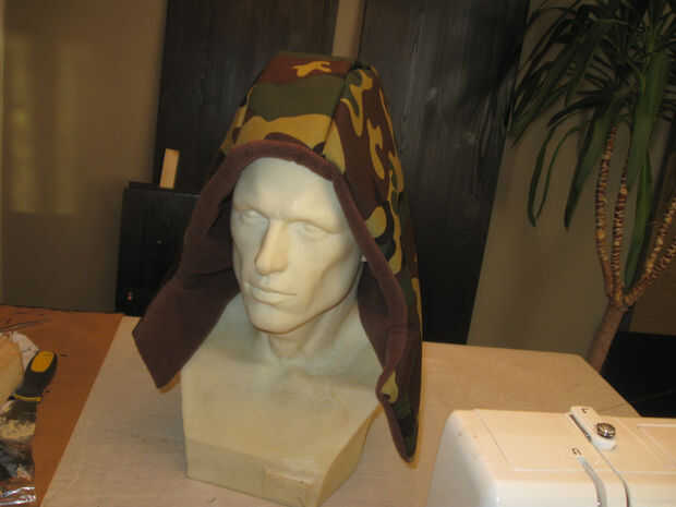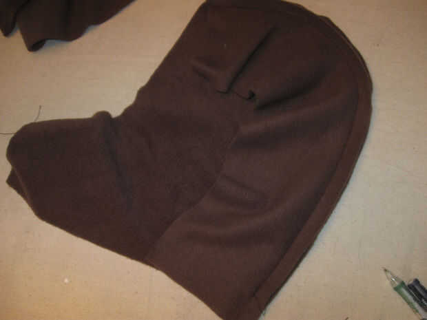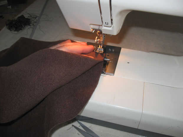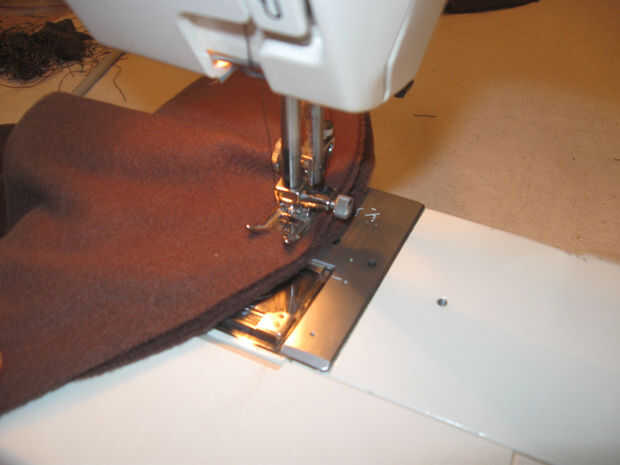 Comience en la parte delantera de la capucha y coser un lado de la chimenea a la tira de centro mediante la línea de costura de 5/8 como guía. El será la curva superior solamente.