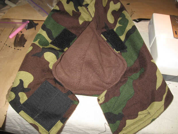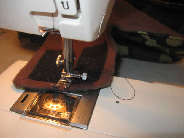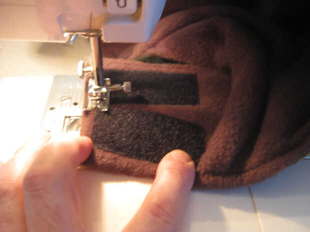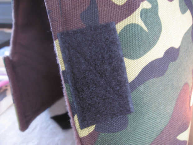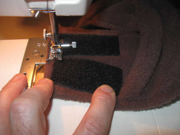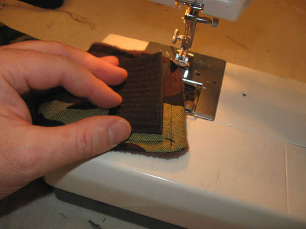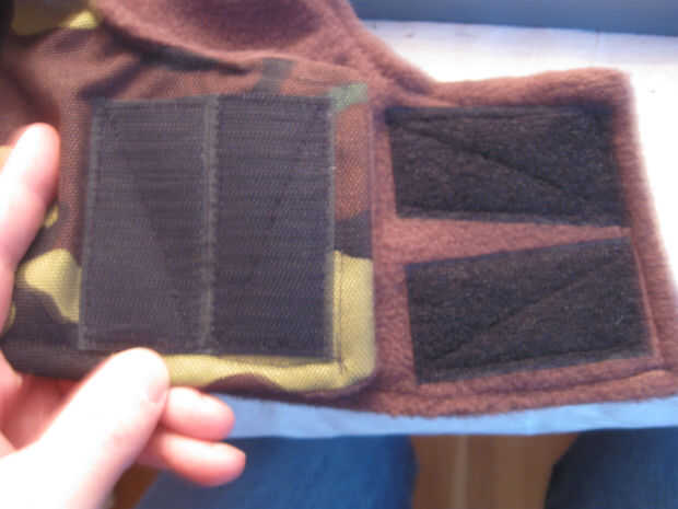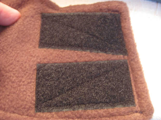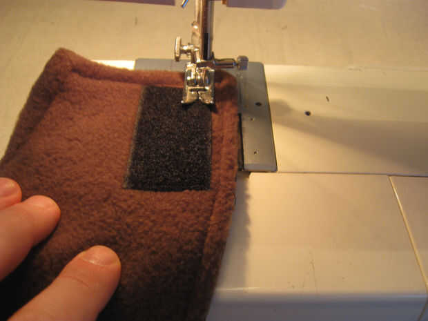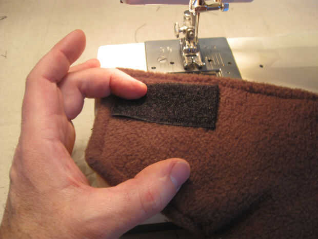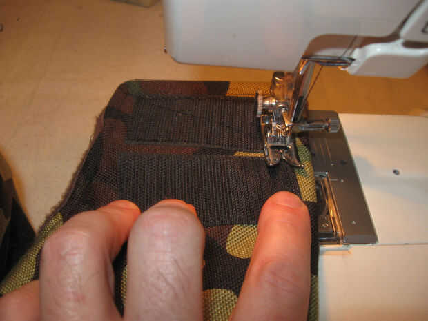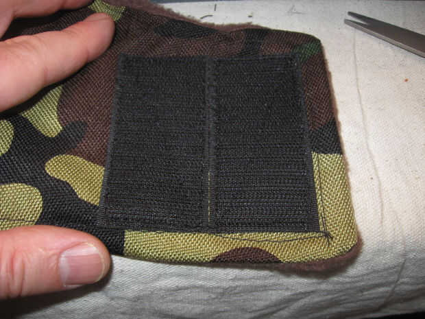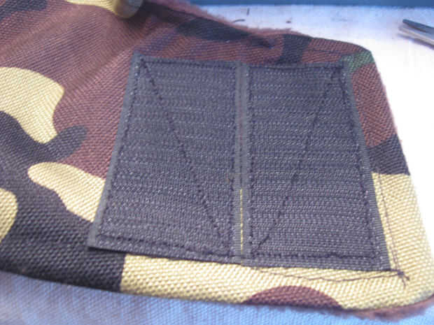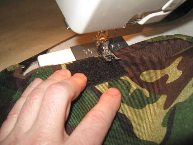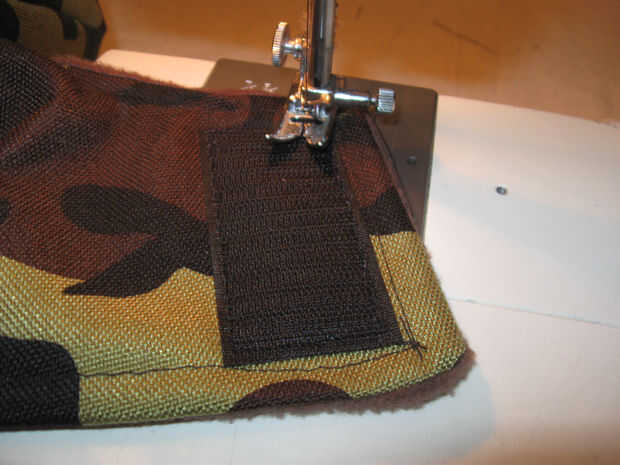 En el material externo coser 2 1,5 pulgadas de ancho por 2,5 pulgadas gancho largo tipo Velcro tiras como se muestra. Coser alrededor del perímetro de las tiras y una vez diagonalmente para una retención adecuada.
