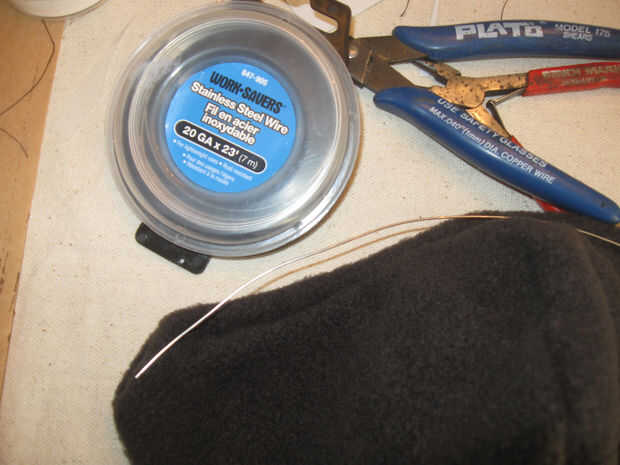 Medir un trozo de alambre de acero inoxidable calibre 20 contra la parte superior de la máscara y se alimentan a través del centro de las 4 capas en la parte superior luego moldear las puntas y meter dentro de las aberturas de 1 pulgada en los extremos.