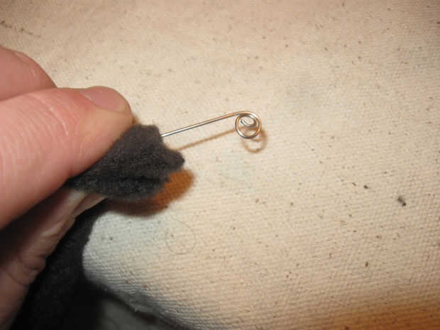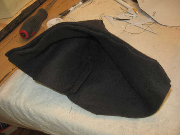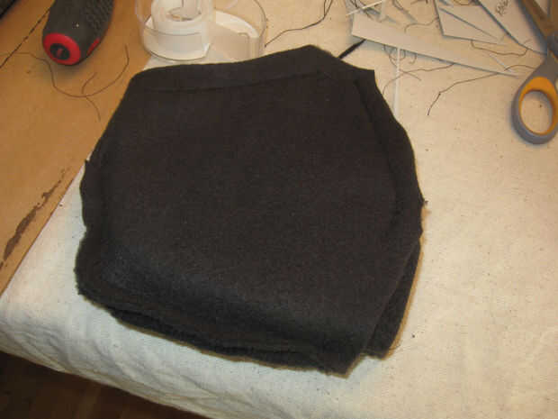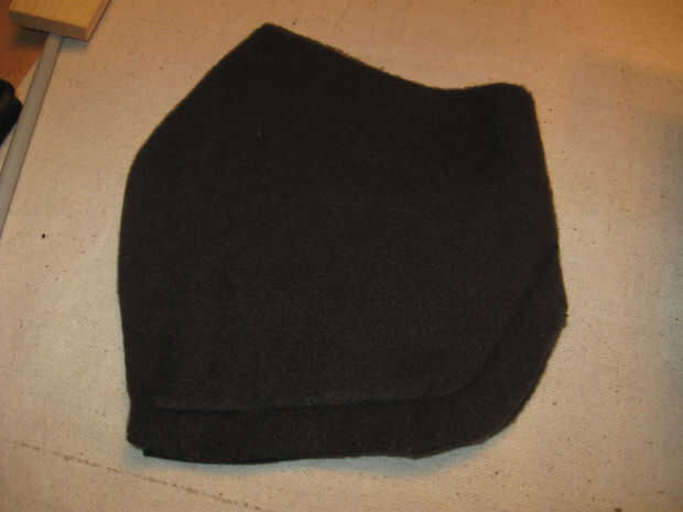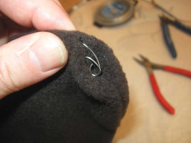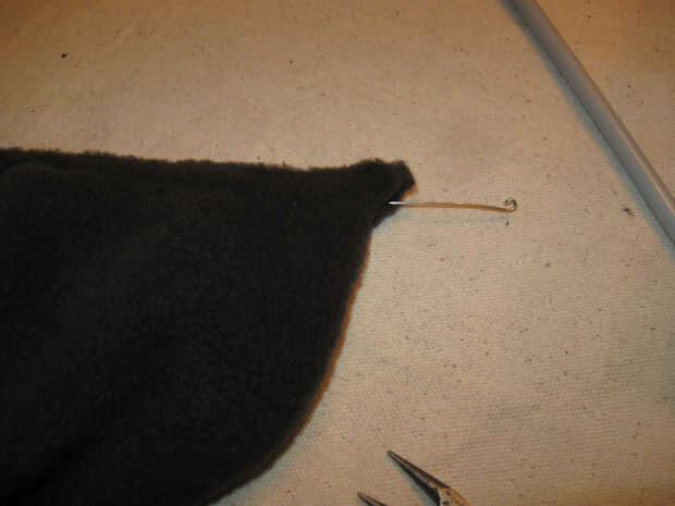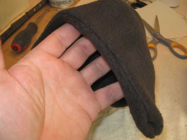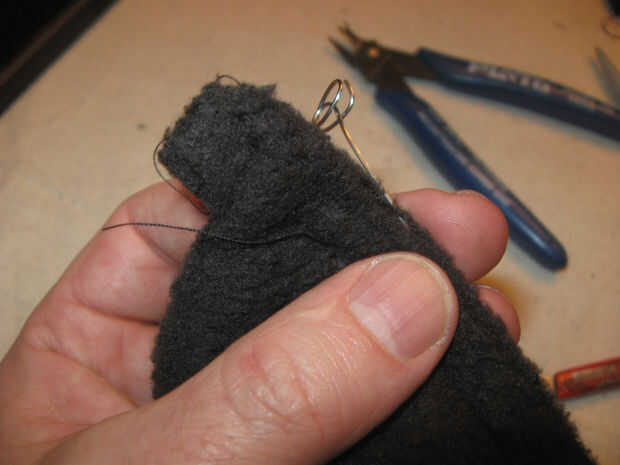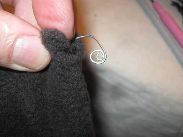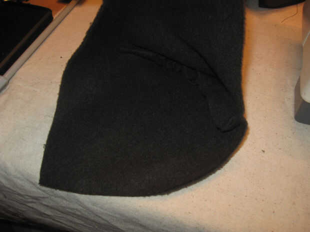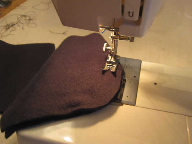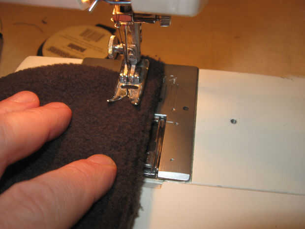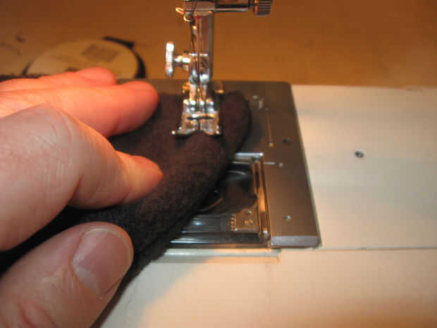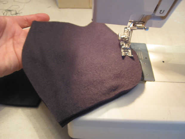 Empezar por tener las dos secciones dobladas con fuzzy lados juntos. Coser desde el pliegue hacia abajo a lo largo de la curva inferior del barrido.