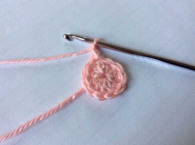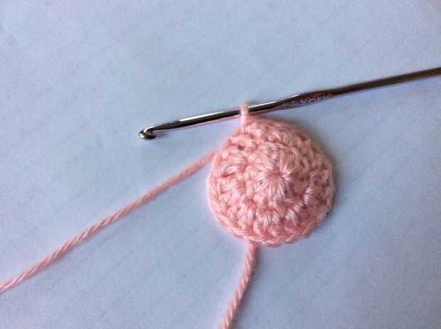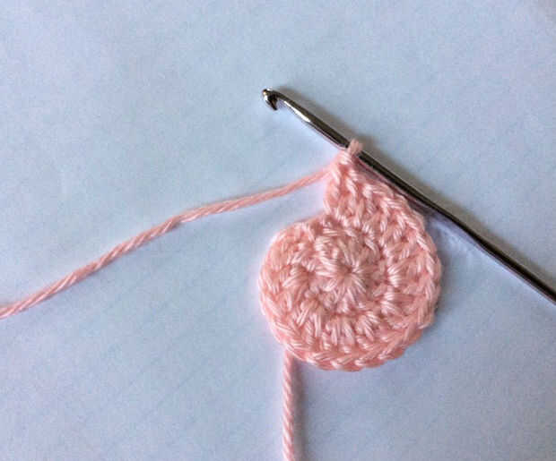 Cadena 2, un DC en el punto siguiente, como se muestra en la figura, 2 DC en cada puntada alrededor. SL st al principio DC y sujete apagado su primer color.
