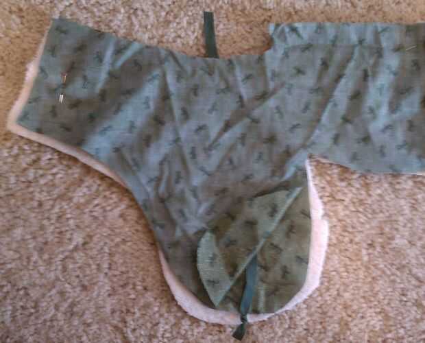 Perno de la solapa de piezas juntos. La capa del paño grueso y suave, algodón derecha arriba, cinta y algodón hacia abajo. Prender todas las piezas juntas.