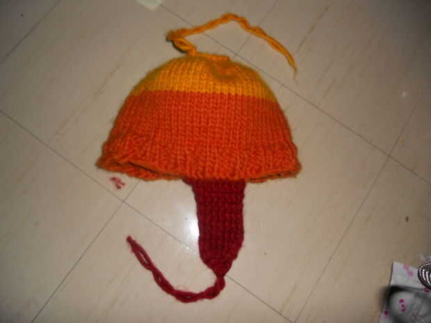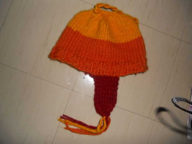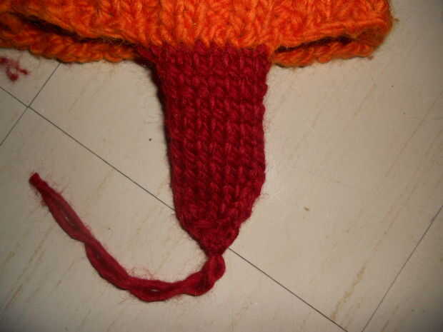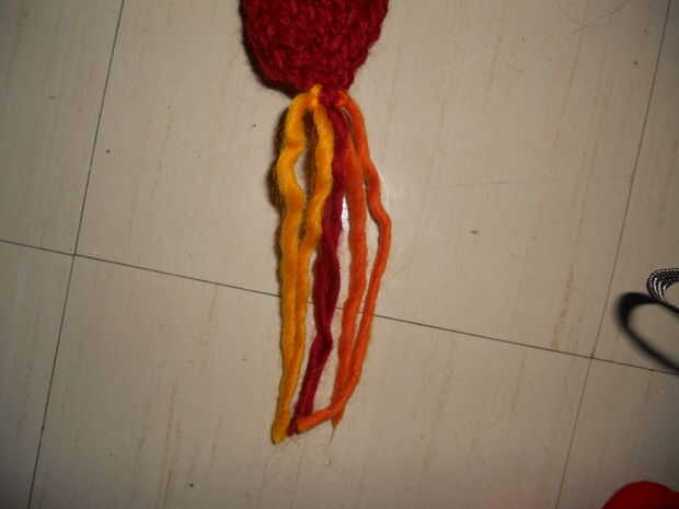 Lazo de estos filamentos en el extremo de la oreja para terminar el efecto de la borla. (Usted debe tener dos filamentos de 4 pulgadas de cada color que cuelga del extremo de la oreja).