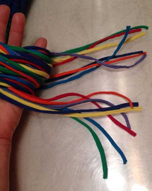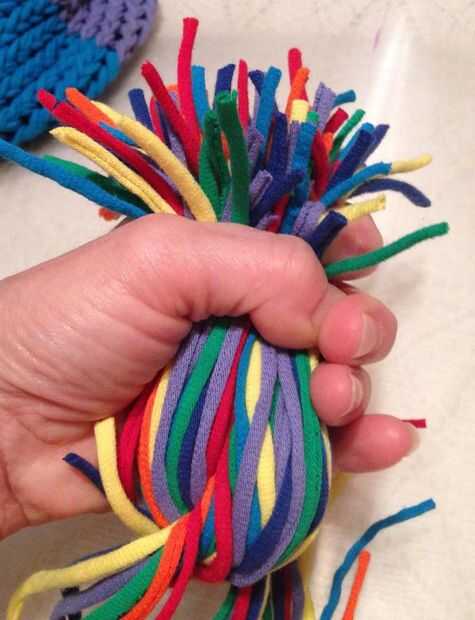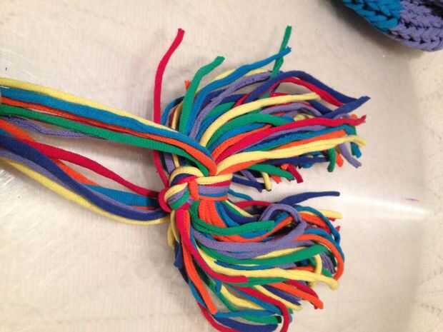Imagen #2 y 3). Con los colores de las bolas de hilado que escogió su sombrero, juntar los extremos y dar los extremos un bonito recorte recto si no ya está ordenados.