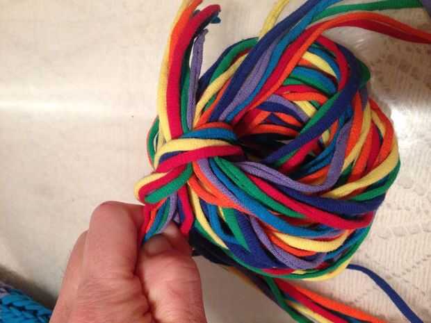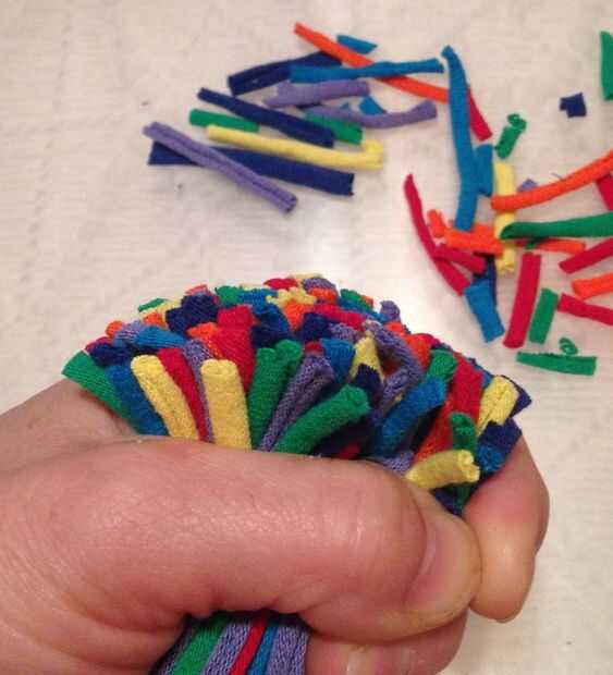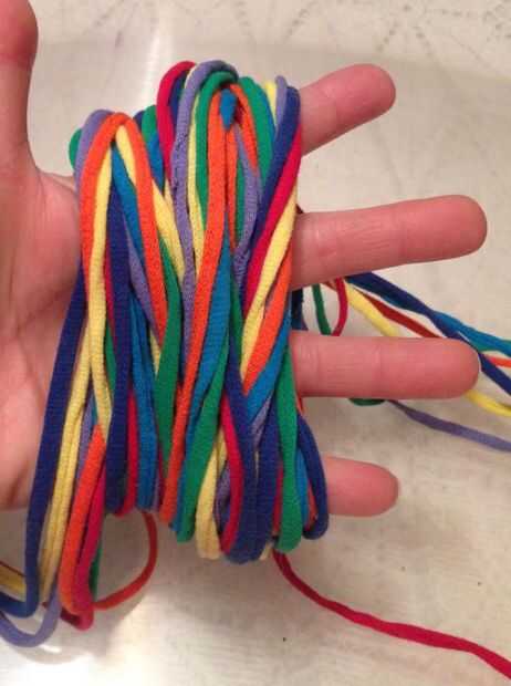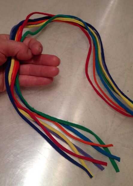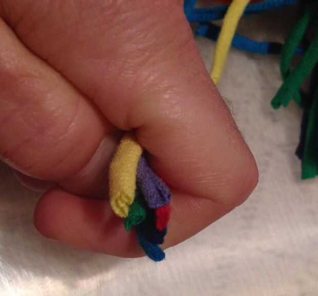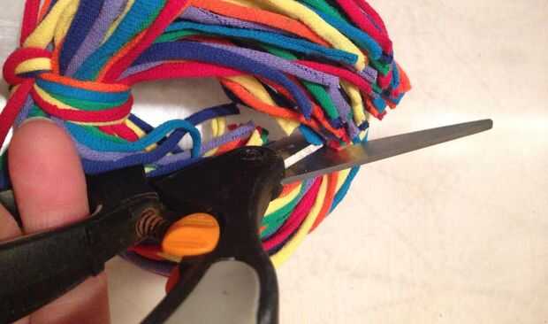 Imágenes #12 y 13). Se reúnen y apriete el grupo de hilado, pellizcando todos los extremos juntos. Usando las tijeras, recorte los extremos bonito y aseados, por lo que son todos de la misma longitud.