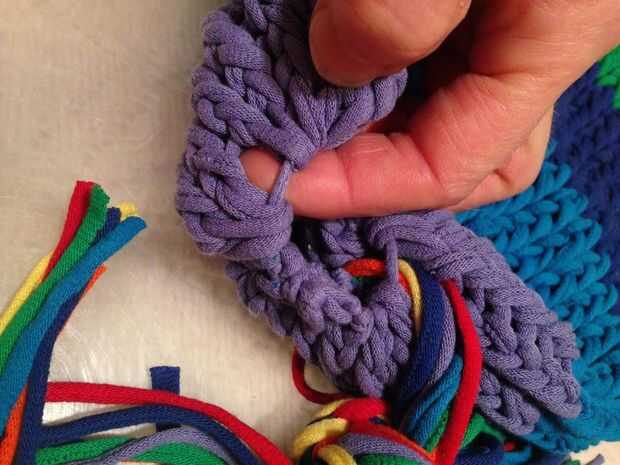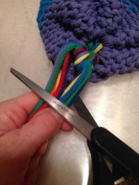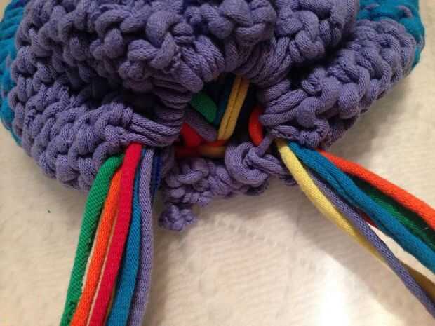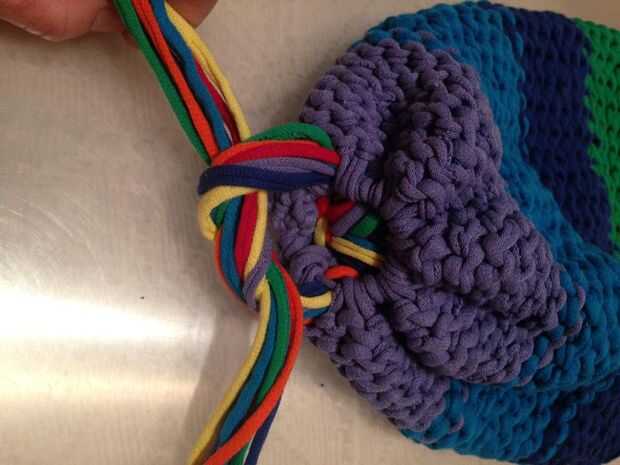 Imagen #1.) Con el sombrero de la vuelta derecha, al final del sombrero, utilice sus dedos para separar los lazos que creamos en el paso #11. Encontrar un circuito que está más cercano el final del sombrero. En este agujero, inserte todos los extremos de un lado del hilado que usted simplemente atado en un nudo. Encontrar un agujero en el lado opuesto y lo mismo con la otra cola. La mano en el sombrero y tire de ambas agrupaciones a través de a lo que es el interior del sombrero, girando el sombrero de adentro hacia afuera como lo hace. Átelo firmemente, al menos dos veces. Recorte los extremos de los nudos y regrese el sombrero como debe ser.