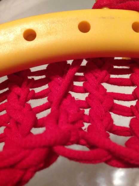 Imágenes #8.) ¿Recuerdo cuando primero comenzamos, nos ató el principio de la cuerda en la clavija en la parte exterior del telar? Puede desatar ahora, pero mantener un ojo en él. Puede seguir adelante y nudo ahora o más tarde. Prefiero hacer todo de mi anudar y tejer en el último paso. Mantenga siempre una cola extra del hilo que va más allá de la zona anudada. Tienes que tejer esto en el interior del sombrero para que no muestra.
