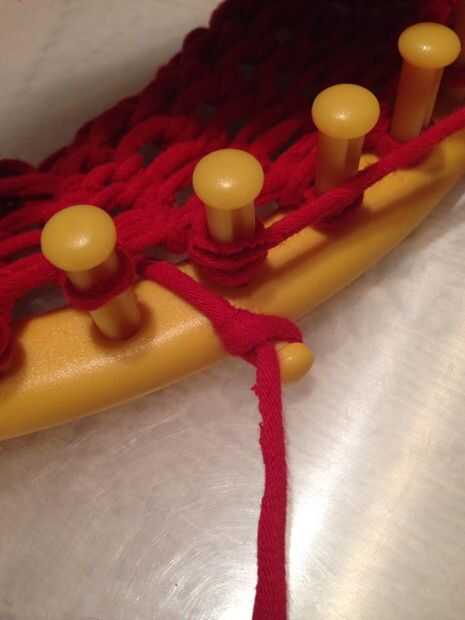 Imagen #1 y 2). Utilizando la herramienta que era (o debería haber sido) incluido con su telar, levantar el lazo inferior en la primera clavija de telar y levantar sobre el otro lazo que quedará en la clavija. Arriba y más. Arriba y más. Arriba y más. (Ojala no se pegó en la cabeza ahora cada vez que se realiza este acto.)