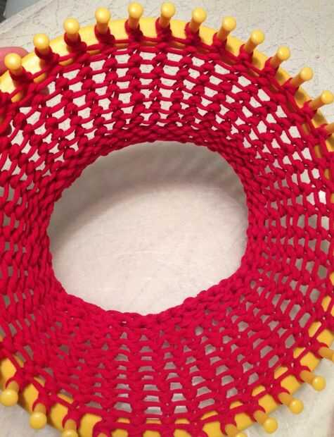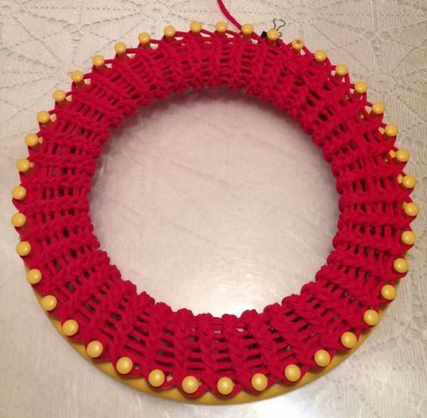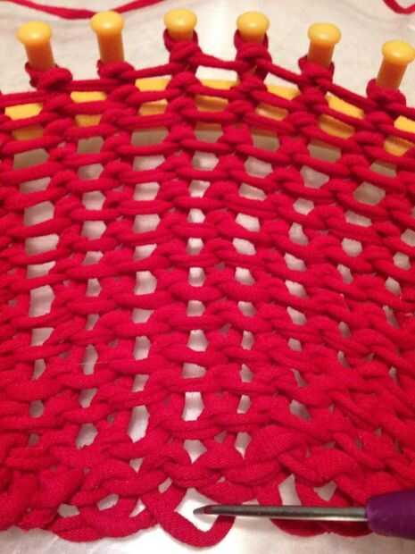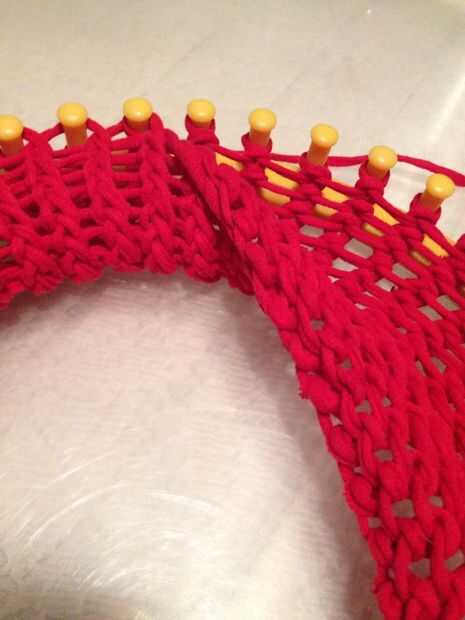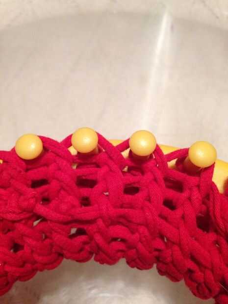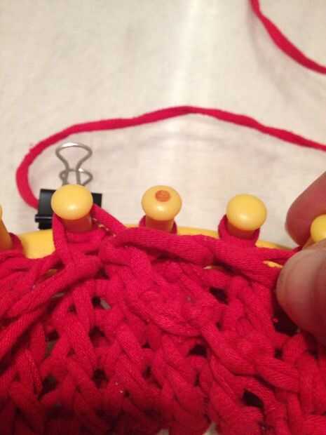 Image #2.) Si usted está viendo la imagen #2 en forma miniatura, agrandarla para que puedan ver el gancho en la parte inferior. El gancho se coloca en el centro del lazo que está más cercano de la línea completa de 'pertenencia' a la clavija hasta por encima de él. No importa que peg comienzas con sólo intentar mantenerlos rectos y en línea. No agarra y lazo de varios lugares en el telar. Hacerlo en orden.
