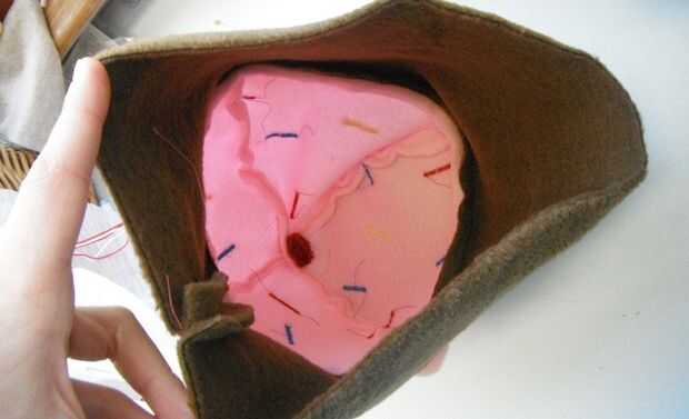 a continuación, vamos a coser la parte superior hasta el borde. Gire el borde interior hacia fuera y luego con la parte superior hacia abajo, ponerlo dentro de la visera. Coinciden en la costura posterior y prender las tres capas juntas. Poner unos alfileres más en el y luego coser todo el perímetro.