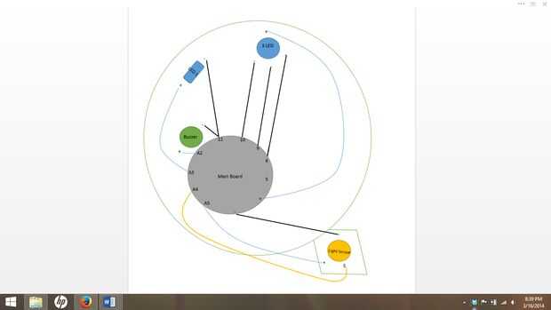 Una vez que había escrito mi código, lo siguiente que hice fue crear un diagrama de mi e-textile, mostrando las conexiones exactas y el diseño de mi circuito, asegurándose de que no negativas y positivas las líneas atravesado y que cada LED, el zumbador y el Sensor estaban bien conectado.
