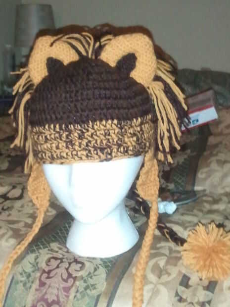 El tenido es sólo un diseño de sombrero de plato simple, doble trenzado y cambiar una sola hebra de dk brown hacia fuera para el color caramelo de la parte inferior. Orejeras de ganchillo, hecho orejas de peluches y hay una trenza cola a partir justo detrás de la crin que va hacia abajo la parte posterior del sombrero, terminando en el pom pom grandes. La melena era una cadena que lado a lado, luego gire la ch 1, dc hasta el fondo a través de. Corta pedacitos de ambos colores de hilado luego se pasan por cada dc, y la tira entera obtiene cosida al sombrero.