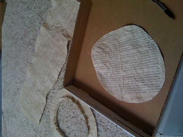 Para este paso, no quiero cortar ciegamente en su papel bastante manchada. Pegue algunas de sus páginas, borde a borde, para formar unas grandes hojas de papel, teniendo en cuenta el tamaño y la forma de las tres partes a su sombrero. Prueba con las páginas menos favoritas en primer lugar, para que puedan hacer algunos de los errores, cambiar de opinión sobre diseño, etc.. Una vez que esté satisfecho con su método, puede hacerlo con su papel de "bueno". Rigidez, hice el borde final de una hoja de doble espesor de páginas: una hoja de las páginas pegadas directamente encima de otro.