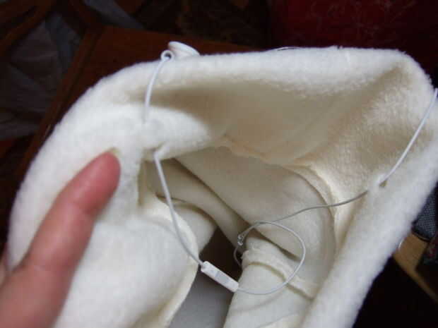Para usar el sombrero: Conecte sus auriculares al dispositivo, dispositivo de deslizamiento en el bolsillo interior de sombrero y botón. poner auriculares a través de ranuras por lo que se enfrentan en el sombrero. Poner en el sombrero.