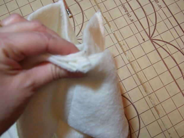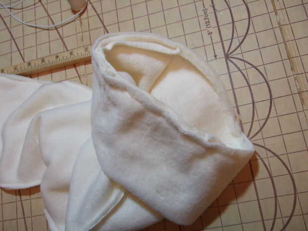 Perno para centrar la costura de la cinta del sombrero (derecho hacia el lado derecho del cono) al cono en el perno. El cono debe ser en el interior y la cinta del sombrero debe ser alrededor del exterior. Debe ser capaz de ver las aberturas auriculares en el exterior.