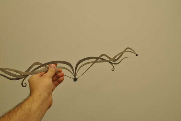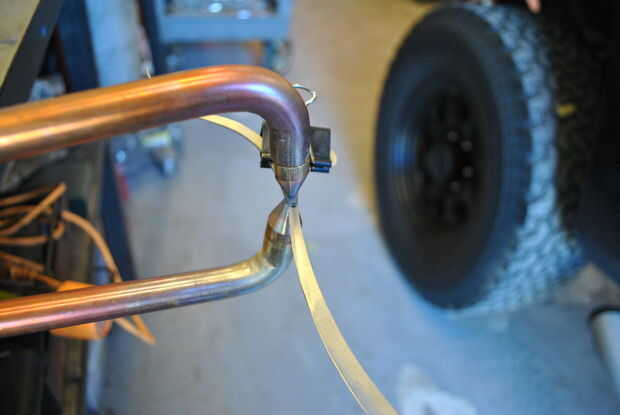 Pueden soldar todos los puntos en este momento, excepto el centro delantero, donde confluyen los dos extremos. Esto debe hacerse después de que el metal ha sido doblado en áspero la forma final. No suelde donde las piezas se cruzan en el centro. Las partes necesitan moverse libremente cuando está doblado y puede ser virase epílogos.