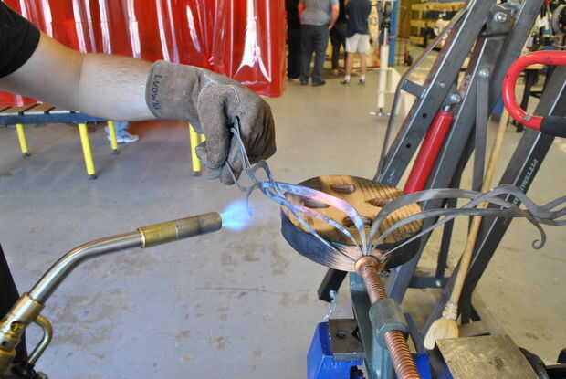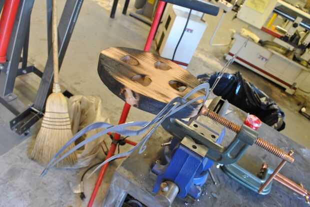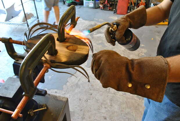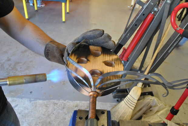 Las piezas son planas, y debe ser curvados.  Cortar un óvalo de roble para lograr una elipse perfectamente simétrica.  Usando un soplete, calentar el metal hasta que quede color naranja brillante.  En este punto, llevará a cabo la mayor parte de la curva de a que doblarla.  La curva no necesita ser hiper extendido ya que la curva se cerrará en el frente.  Las piezas desunidas a ambos lados tendrán que ser doblado por separado.