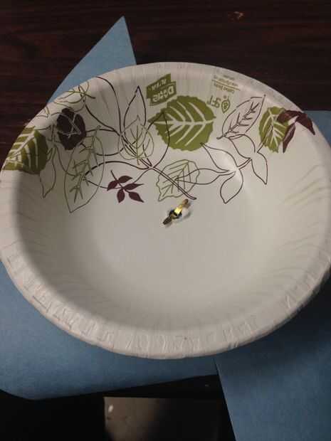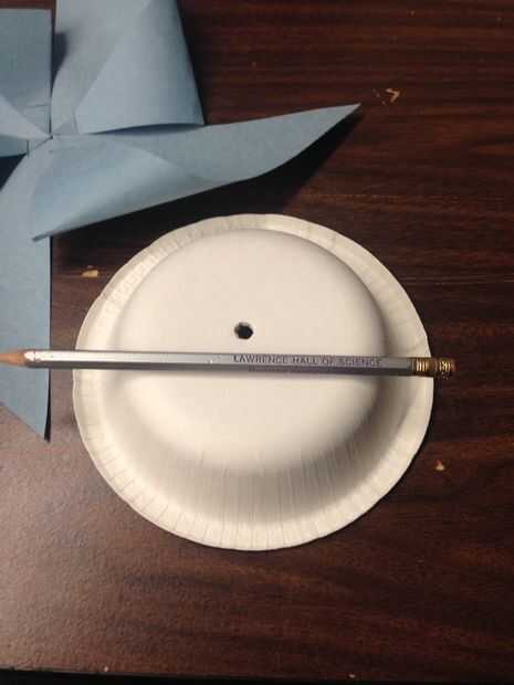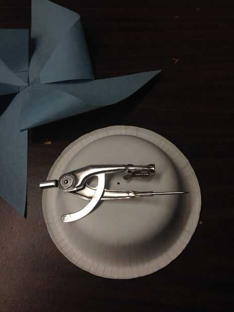 Utilice una brújula y una pluma o lápiz para hacer un agujero en el centro de la rueda y el tazón de fuente de papel.