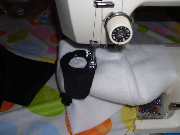 Una vez alineados. Coser 1/4 de pulgada o menos en el interior de los parches negros, ojos y nariz.