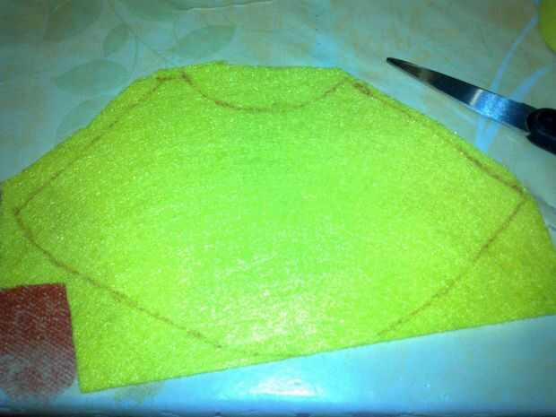 -Tome uno de sus rectángulos amarillos y lugar el borde del objeto circular tan cerca el borde largo como sea posible, luego trazar la curva alrededor de él con el marcador de fuga (o literalmente cualquier otra pluma, marcador, etc. ya que este borde va a ser escondido dentro del sombrero de todos modos)