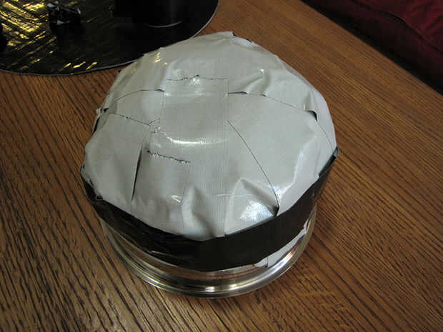 Cinta de conducto por la parte exterior del tazón de fuente con el lado adhesivo hacia fuera.  Asegúrese de que el recipiente se cubre totalmente.  Esta es la parte más difícil y más difícil de estas instrucciones.
