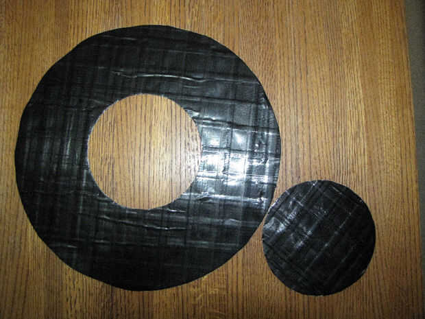 Usar un cuchillo o tijeras para cortar el círculo más pequeño.  El círculo de la cinta de conducto negro ahora debe ser la forma correcta para convertirse en el ala del sombrero.  Deseche el círculo más pequeño de la cinta de conducto negro.  Ya no es necesario.