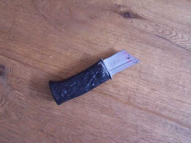 Primero tienes que cortar el cuchillo en dos con un par de sciccors. A continuación tienes que taladrar un orificio muy pequeño en el cuchillo (foto). También puede hacer un agujero con un cuchillo si no tienes un taladro