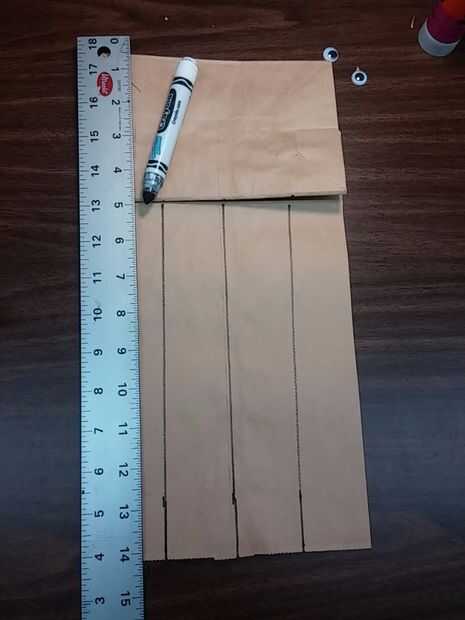 Utilizando tu regla otra vez, se extienden las marcas hasta el fondo de la bolsa y hasta el borde inferior de la aleta.
