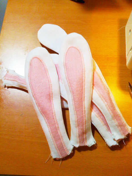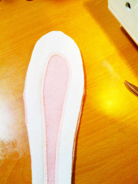 Ahora ponga la segunda parte de la oreja sobre la parte delantera y coser alrededor de los bordes. Hacerlo desde el lado con el fieltro, así que no te del fieltro dentro de la costura (o a granel para arriba). Girar las orejas hacia fuera y tendrás una especie de punto de bolsillo sobre el fieltro más rígido, que soporta el oído entero. Quise decirles de hierro para que sean más planas, pero recuerdo!