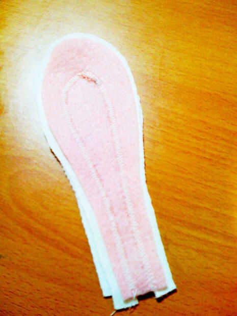 Para el oído complicado, podrá crear en primer lugar, la parte delantera de la oreja y luego puntada y gire de la manera habitual. Tomar una oreja de fieltro y un oído de tela y colocarlos juntos. Coser una línea donde desea que el borde del oído interno que. Luego cortar la tela del knit en el interior de esta línea, para revelar el fieltro por debajo. Para poner en orden este borde, usando hilos de color de rosa, coser una puntada satén alrededor de la misma línea. Pude enderezar un lugar donde había se tambaleó en la línea de costura original.