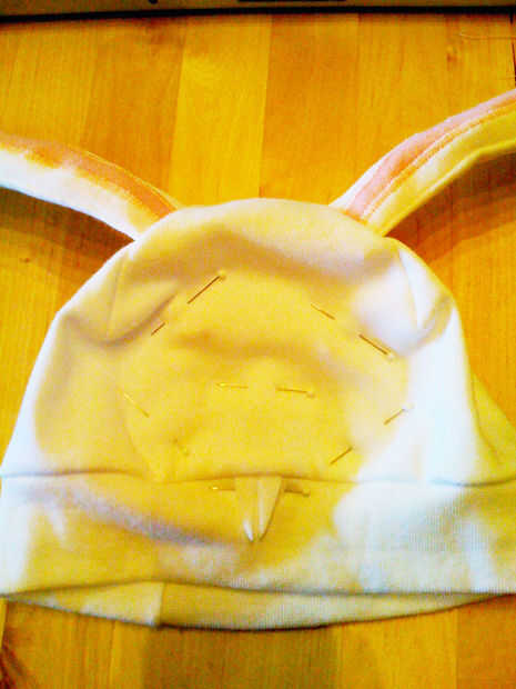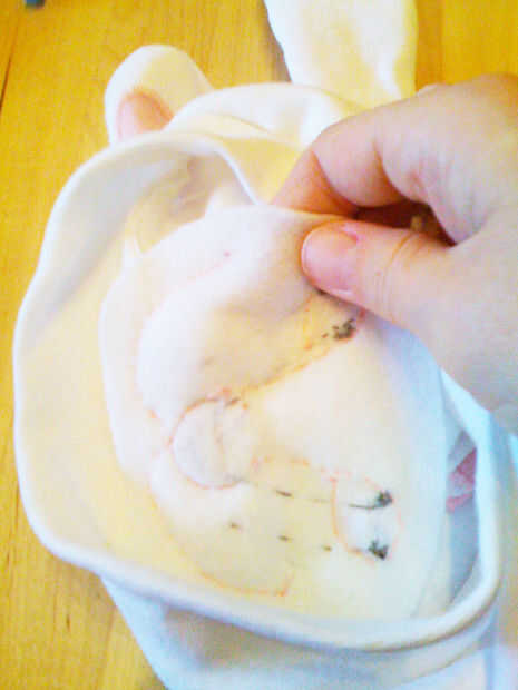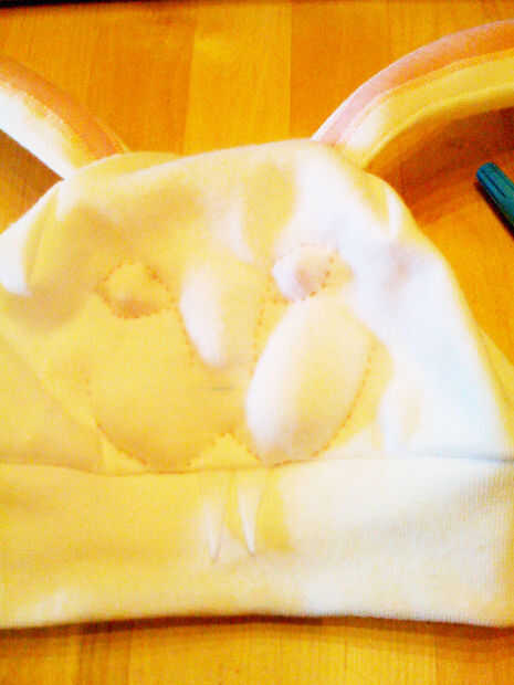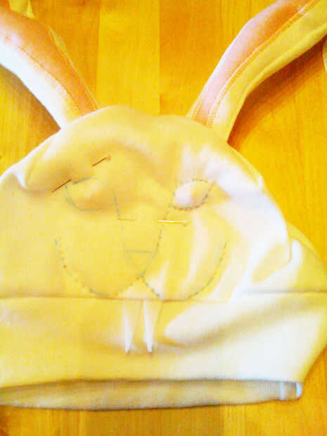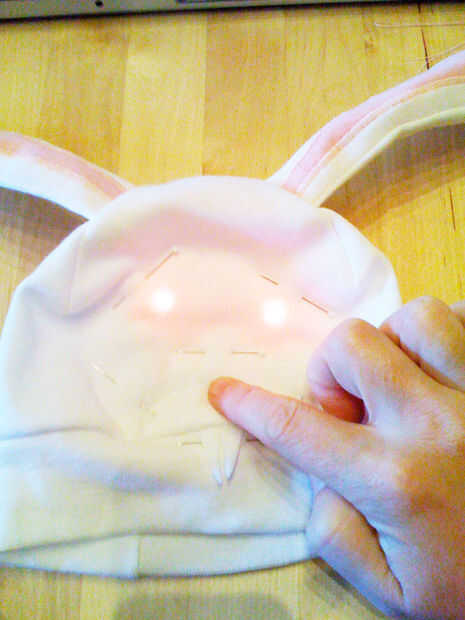 Usando una pluma o aire-soluble en agua, dibujar una cara de conejo en el sombrero, con los ojos sobre los LEDs y la nariz sobre la batería. Pespunte a lo largo de estas líneas con hilo no conductora y enjuague las marcas (uso un dedo sumergido en el agua, no mojar!)