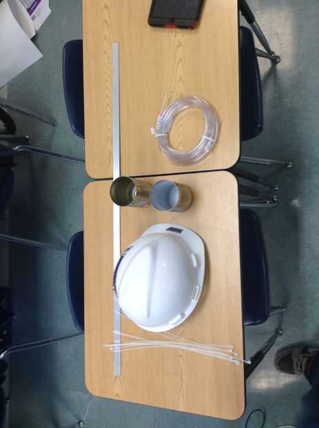 Lo que necesitas es un casco. Usted puede obtener de mínimos, o Home Depot por seis dólares. Dos latas de sopa, lavadas!! 4 abrazaderas de plástico fino tubo de goma. Cuatro piezas del metal de hoja (lo obtuve de mi profesor de taller) el metal debe ser de 6,5 cm de alto y 2 cm de ancho. Asegúrese de que su casco tiene pequeñas aberturas en el lado, cuando usted consigue su sombrero duro sabes lo que quiero decir cuando lo consigues. Por último usted necesita 1/4" abrazaderas de cable