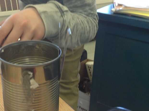 Tomar una sierra para metales y cortar una fina hendidura en el lado de la lata, esto funcionará porque el can está ronda. Ahora puedes toman el metal y deslícelo through(see picture) en?? Ahora hacer lo mismo en el otro lado.