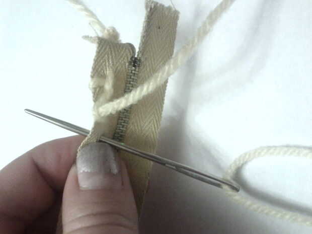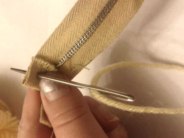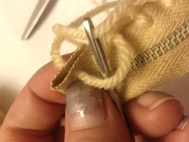 a continuación introduzca la aguja en la parte de tela de la cremallera y tire del hilo a través de. Ake que nudo final del hilo primero.