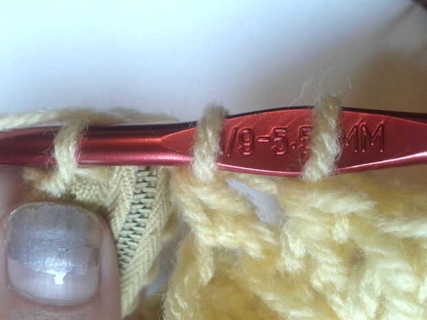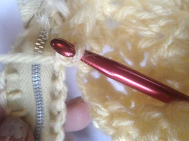 1DC en cada puntada hasta llegar a la cremallera. al llegar a la puntada de resbalón de cremallera en cada puntada. Cuando se hace con la cremallera continuar con dc para puntadas restantes en esa fila.