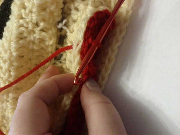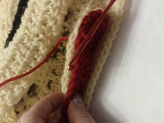 slipstitch final de la fila y convertir su trabajo, cadena 3 y una fila más de rojo sólo en la parte inferior y luego p.de cadeneta de ganchillo.