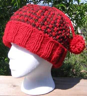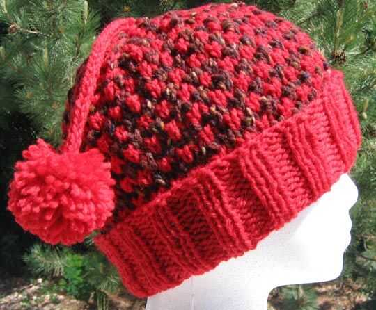 este sombrero de tweed-mira, se muestra en un combo rojo/marrón, fue un experimento para tratar un nuevo patrón de la puntada. Salió mejor de lo previsto! El sombrero de la muestra fue tejer en redondo en un tamaño 8 16" aguja circular, de banda a corona en peso básico de lana lana y mezcla de lana (lana clásica de los Patons roja y marrón Queensland Katmandú Aran.) Después el K2, P2 de la costilla, el patrón de tweed simple está formado por alternadas dos rondas llano de punto en el primer color con dos rondas K1, K1B en el segundo color. La corona se reduce a 3 puntos que son de punto en una-cuerda larga, con pompón hinchable atado en el extremo. Patrón en http://www.piece-by-piece.net/Knit/tweed_look_hat.htm