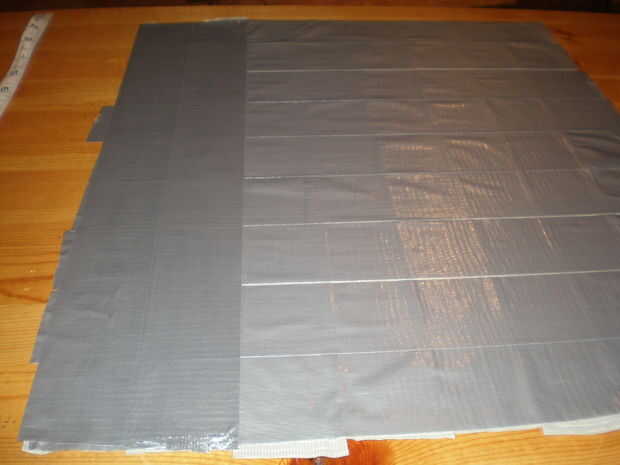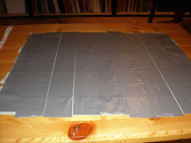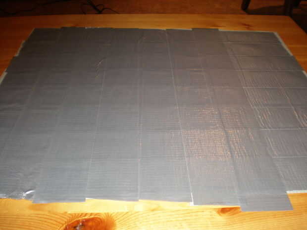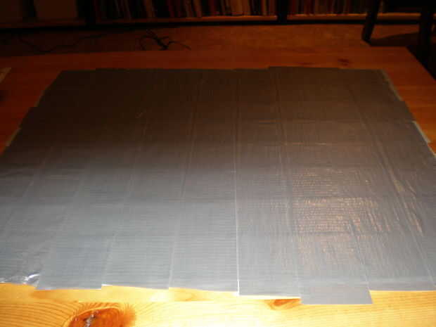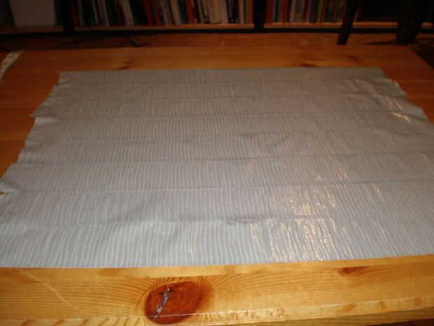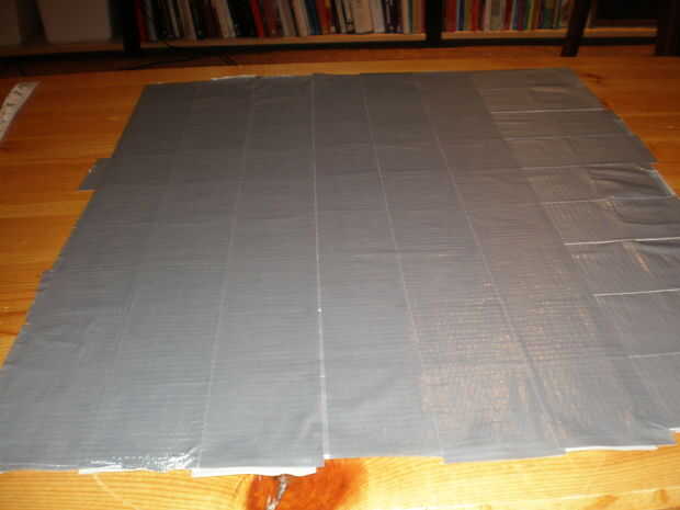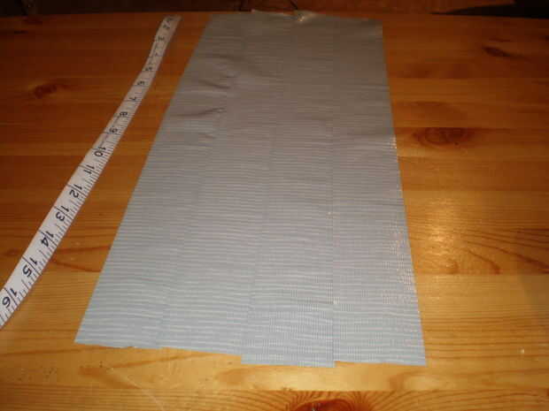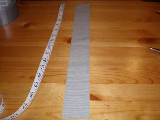 hice el borde del sombrero con tiras de capas de cinta adhesiva. Hice mi borde espesor 4 capas, pero podría ir más grueso, dependiendo de cómo tieso desea que el borde. Podría ser una buena idea medir su cabeza para tener una idea de cómo hacer esta primera hoja. Creo que hice mía 16 por 13 pulgadas, esto me dio espacio suficiente para un borde de tres pulgadas, y una cabeza agujero cerca de 6 por 8 pulgadas.