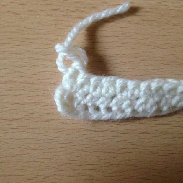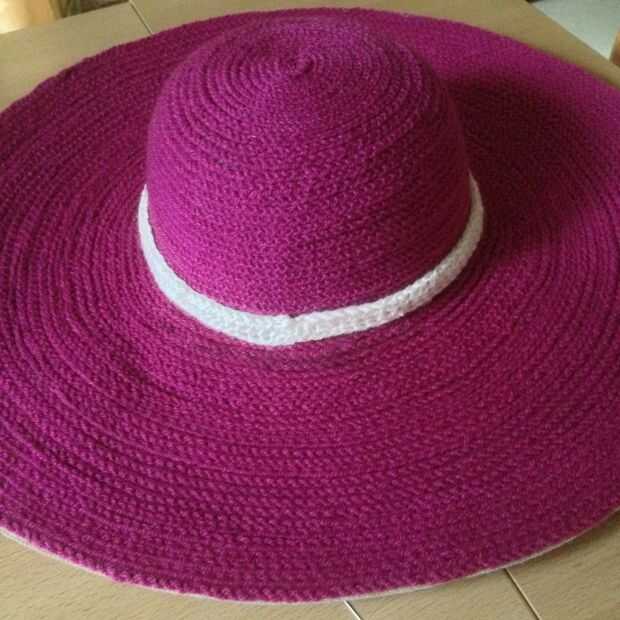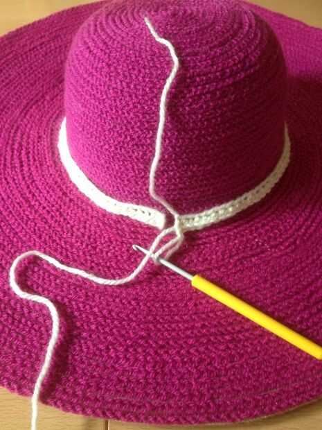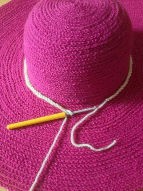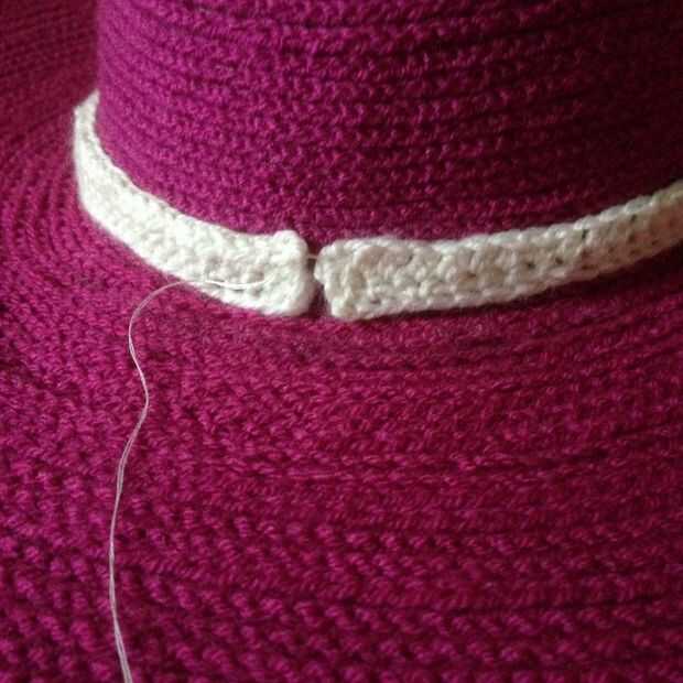 Para la correa de contraste alrededor del sombrero lo hice puntadas de cadena 100, alrededor de la parte inferior. (Ver imagen 2) Puesto que el hilo se estira un poco hacer un poco menos de la cantidad requerida.