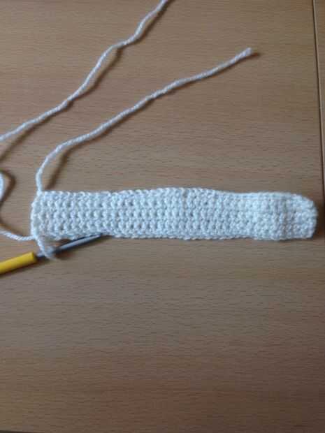 Hice 30 puntadas de cadena y seguir la banda con punto bajo. He hecho siete filas de punto bajo. La longitud de la banda es de 8 pulgadas. Doblar la banda en dos y se unen, un nudo para asegurar y coser en las colas.