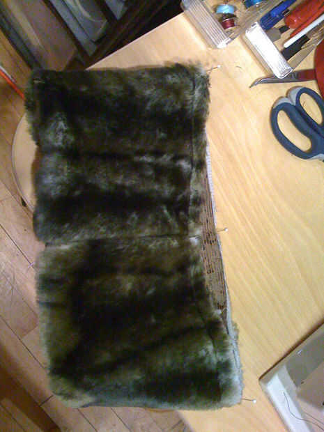 Ahora prender las dos secciones en cada uno de los puntos marcados del cuarto. Los lados deben ser interior hacia fuera (tela suave en el exterior) y la corona debe ser invertida.