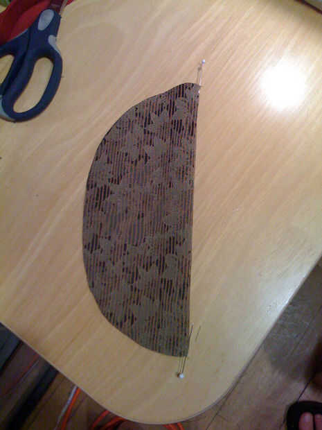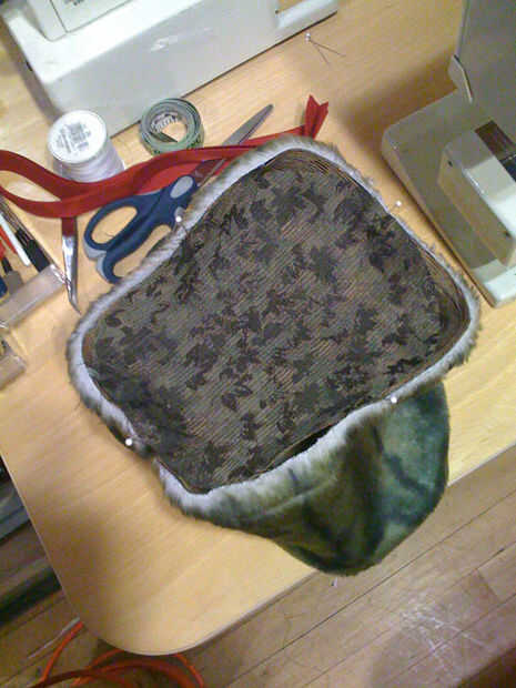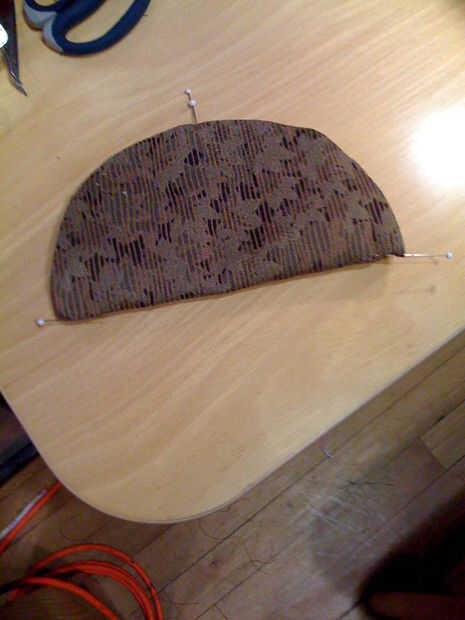 Y los lados del sombrero por debajo de la corona en la parte superior, coser por el borde en aproximadamente la línea que cosieron los dos lados a lo largo. Asegúrese de que las piezas permanecen emparejadas para arriba en las clavijas y tenga cuidado de no obtener un pliegue de la pieza atrapado debajo de la costura. Quizás tenga que hacer un margen más o menos grandes en la corona dependiendo de qué tan bien las longitudes coinciden, o que tenga que estirar un poco los trozos diagonales. Todo esto está bien, no se mostrará en el exterior.