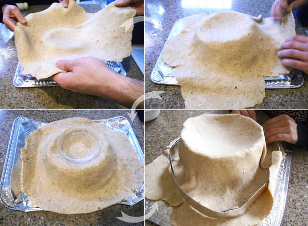 Con el molde cubierto, coloqué un recipiente en la corona para actuar como un peso y tire hacia abajo la parte de la masa. Porciones de la masa tuvieron que ser estirado/ceñida alrededor de la cinta, ser suave con pasta fina.