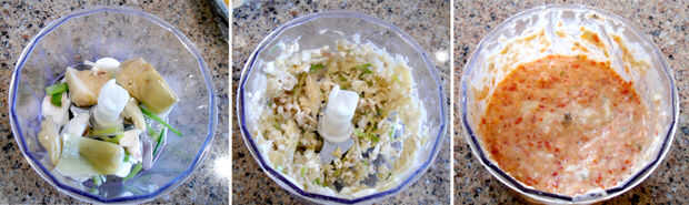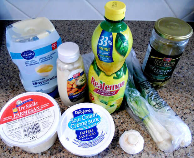 Mi inmersión fue un asado de pimiento rojo y dip de alcachofa. La imagen que se muestra es sólo lo saqué de mi nevera, no todo lo que es en esta inmersión. Pensar como una sugerencia para construir su propia variedad de.