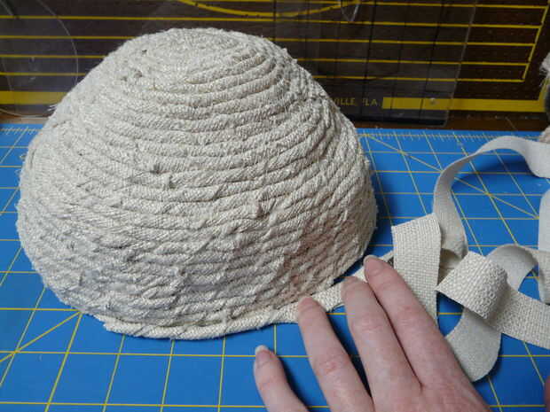 Coloque la bobina en un ángulo de 90 grados a la corona del sombrero, por lo que ahora está construyendo al lado de sus bobinas anteriores, en lugar de la parte inferior. Que puedes hacer unos pins, si ayuda. Mano coser el cordón para dos revoluciones completas alrededor del sombrero.
