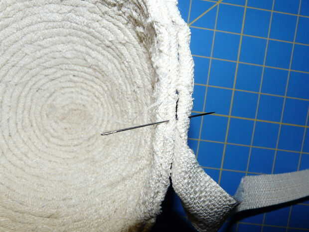 Recomiendo hacer esta siguiente parte a mano. Usted necesitará cambiar el ángulo de las bobinas muy dramáticamente, y que es bastante difícil de hacer por la máquina. Conseguir una aguja de mano grande y rosca con una longitud doble de hilo.