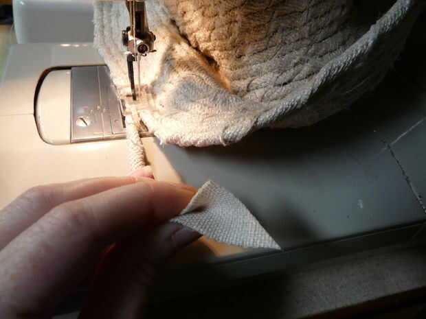 Cuando el borde es tan amplio como usted quiere, corte la tira que está trabajando con un ángulo. Dele vuelta y coser abajo como que has estado haciendo, pespuntes cuando esté listo para bloquear tus puntadas.
